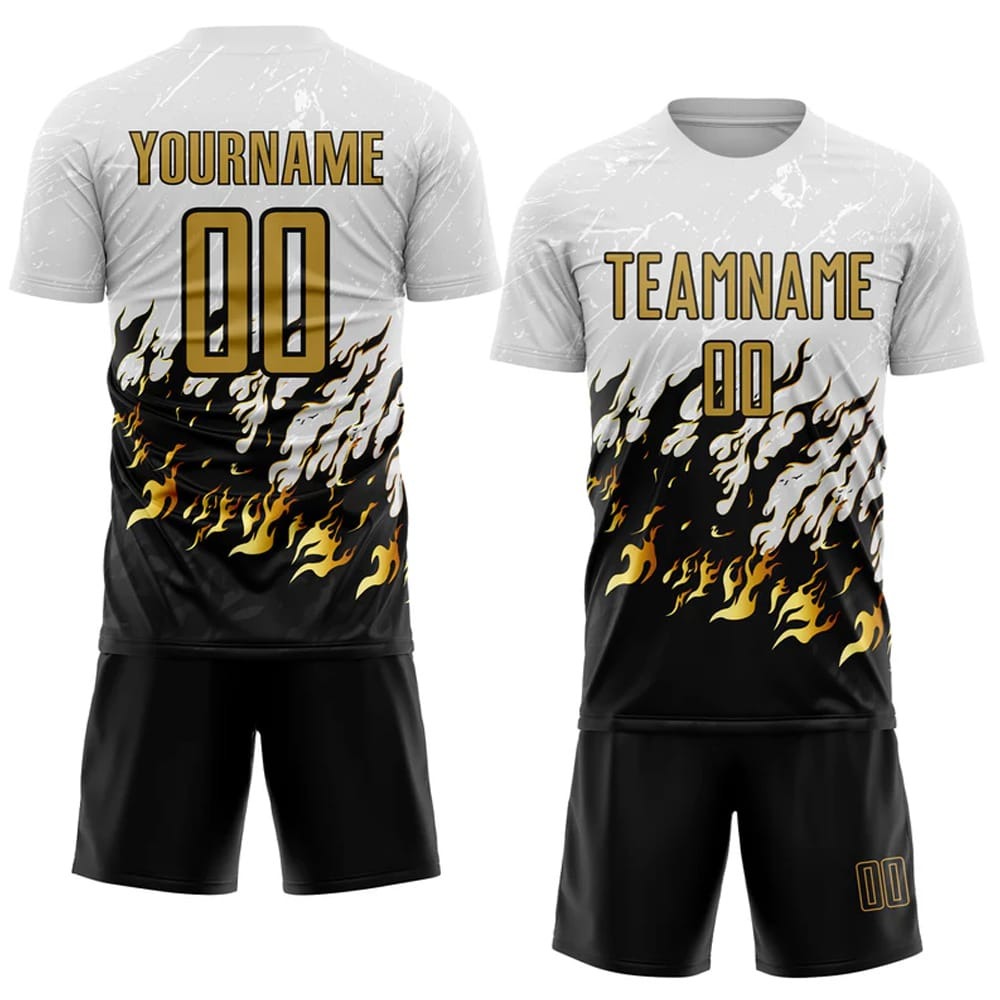 Home SPORTS WEARS Soccer Uniforms Custom White Old Gold-Black Flame